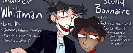 Vincent Mulder Whittman is a ghost/demon hunter. Alastor Scully Bonnaire is his older, richer partner-in-crime. (SPARSE)Tumblr Tag